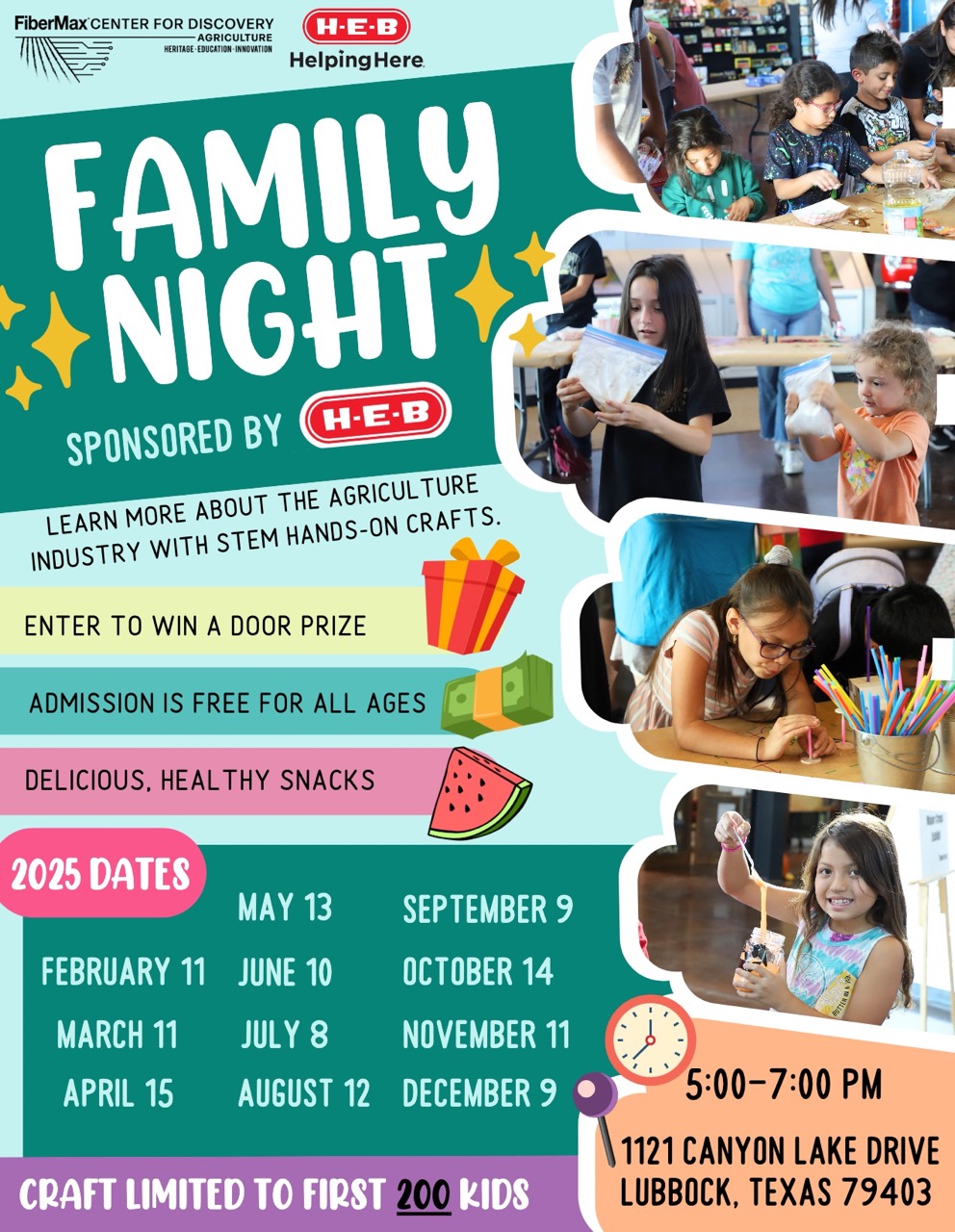 The FiberMax Center for Discovery has partnered with HEB to create a fun and free opportunity for families to visit the museum. We plan to offer different crafts and activities each month for children and families to do together. Activity kits will be provided for the first 100 people, and in addition to activities, the museum will be open and all exhibits will be on. Family nights will be held the second Tuesday of every month, with the exception of April being on the third Tuesday, starting in February 2025 from 5:00 to 7:00. This is after work but not too late to be home for dinner. We welcome all families to attend.